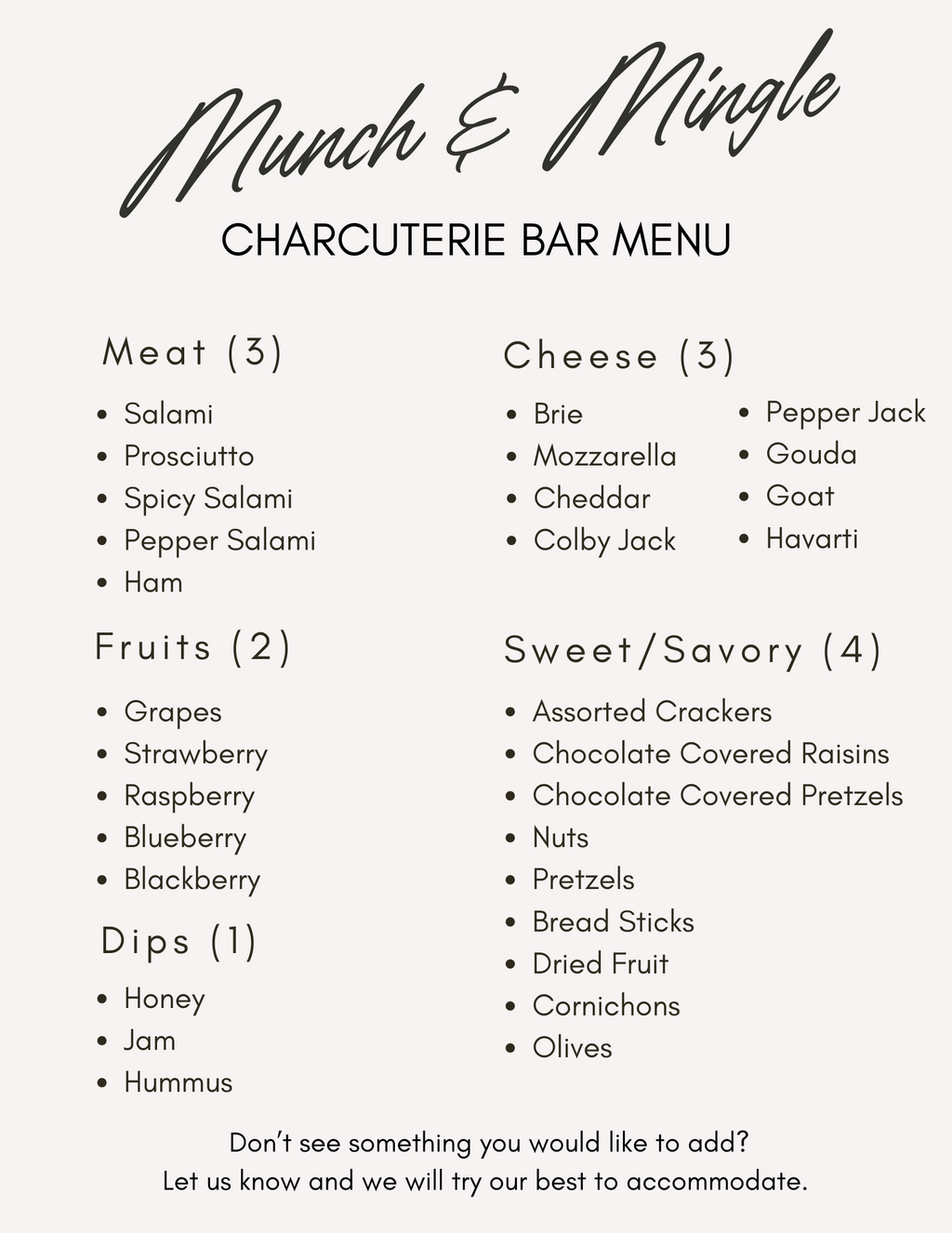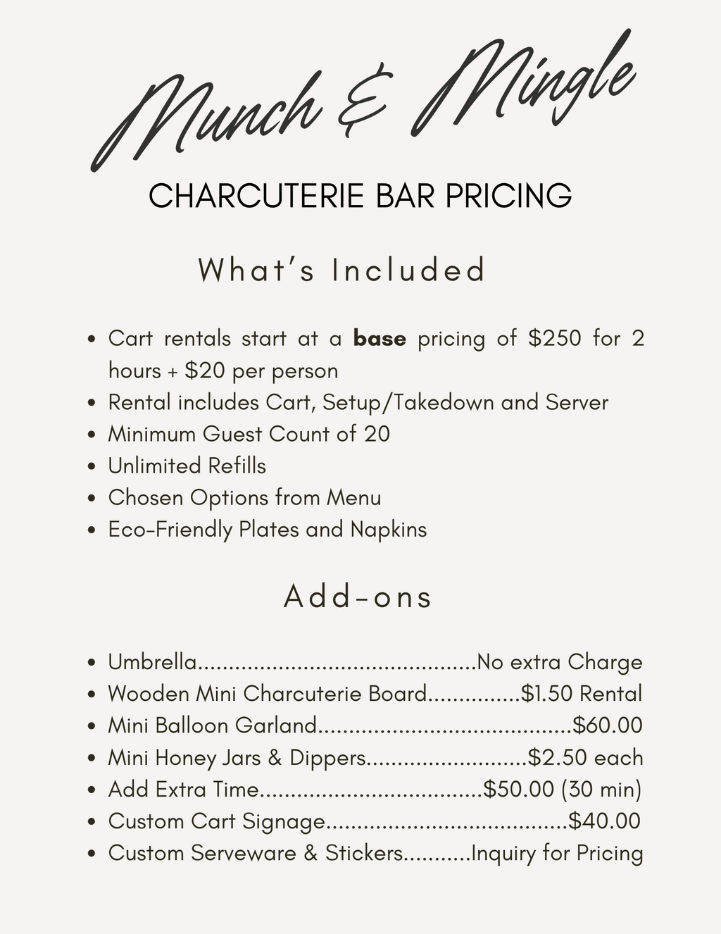 From personalized serveware, cart signs and stickers to high-quality food containers with lids and ice trays, we ensure that everything stays fresh, chilled, and bug-free. Our attention to detail and commitment to quality set us apart, making every event we cater a truly Munch & Mingle moment!
